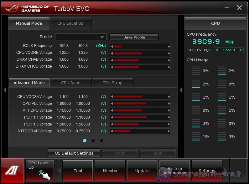 Grazie al solido sistema di alimentazione DIGI+ che accompagna la Rampage IV Formula come tutta la serie ROG, si può agire anche tramite l’interfaccia software Asus DIGI+ regolando il livello del Load-line Calibration, molto importante per rendere quanto più stabile possibile l’erogazione della tensione alla CPU anche in presenza di forte assorbimento. Altro tool fondamentale per effettuare l’overclock del sistema senza dover ogni volta riavviare e rientrare nel bios, è il conosciutissimo TurboV EVO che vi mostriamo di seguito