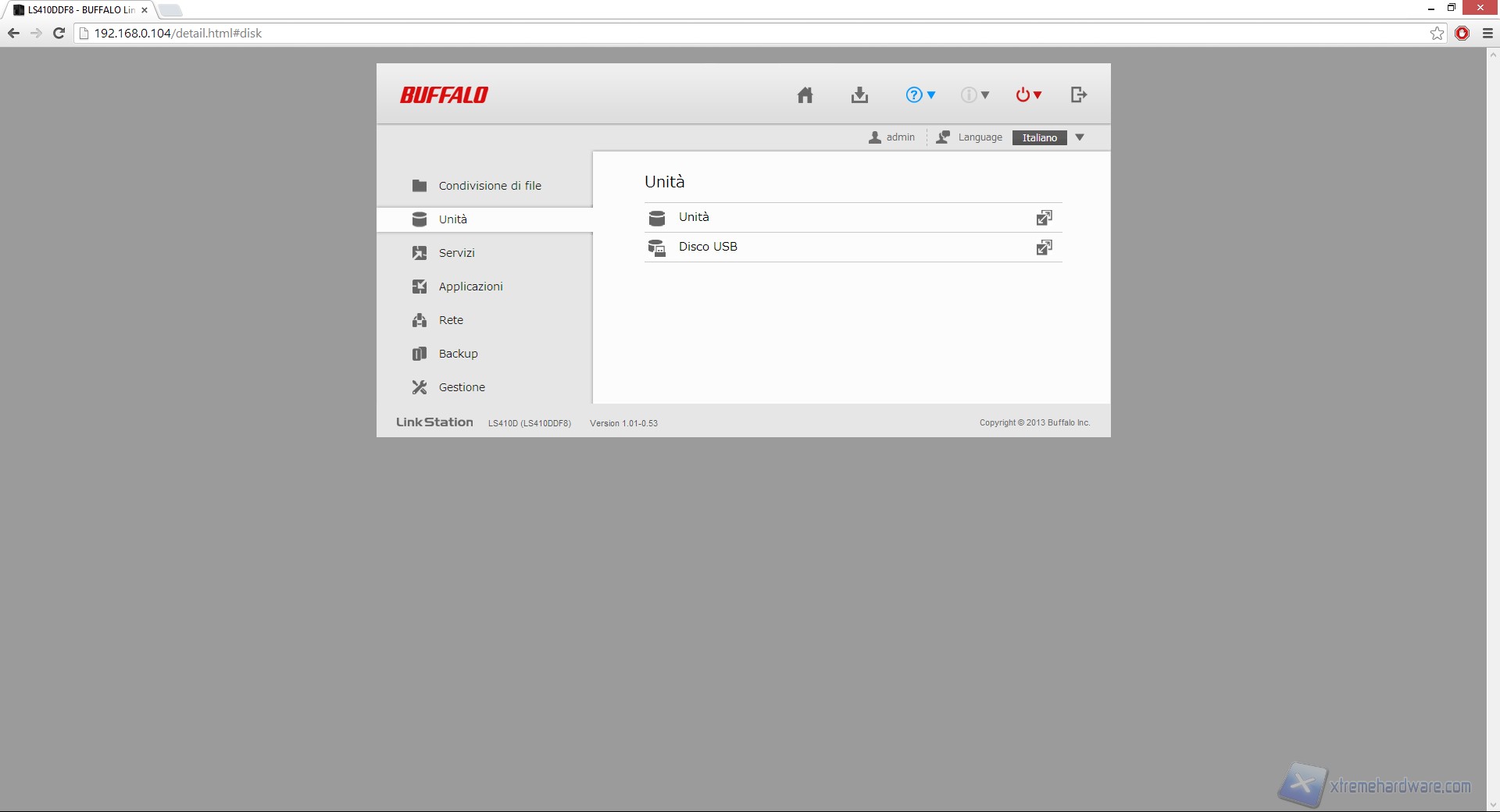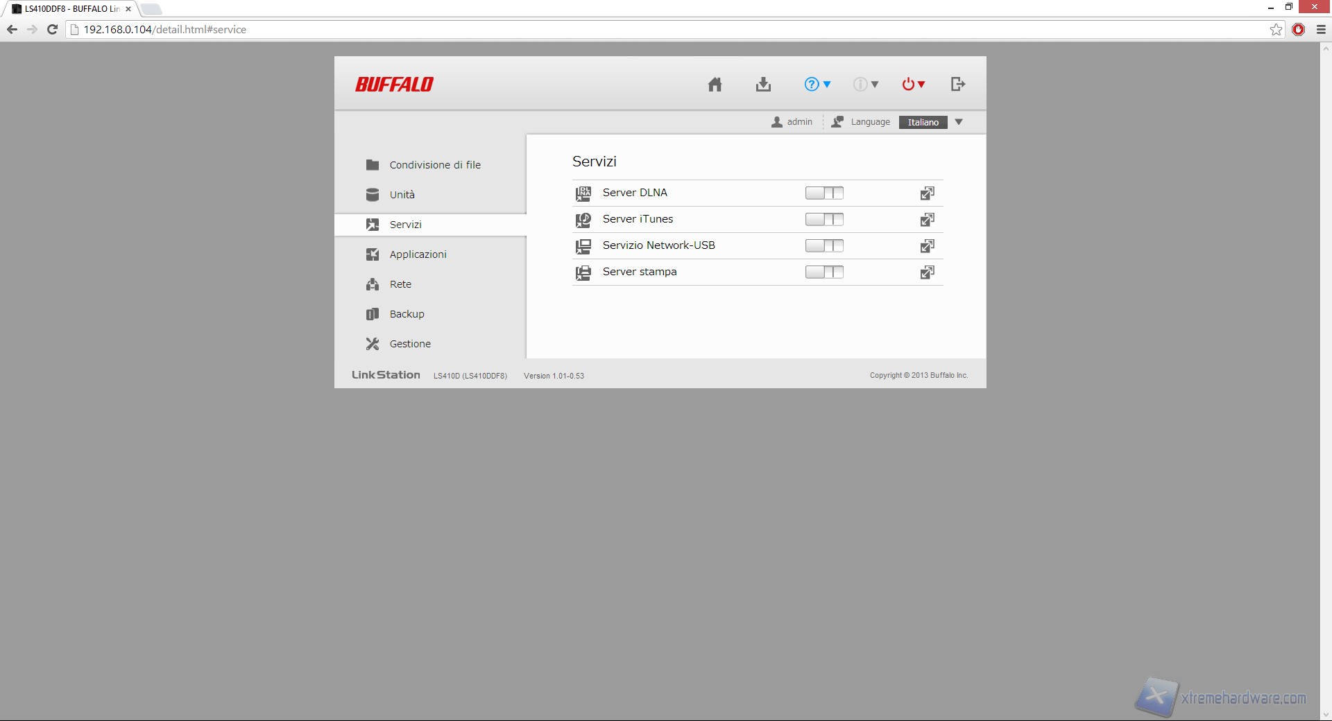 Nella sezione "Unità" abbiamo la possibilità di vedere lo status del disco interno o formattarlo, mentre andando avanti nel sotto-menù "Servizi" e "BitTorrent" possiamo abilitare o disabilitare quelle funzioni che troviamo in prima pagina e che abbiamo già descritto.