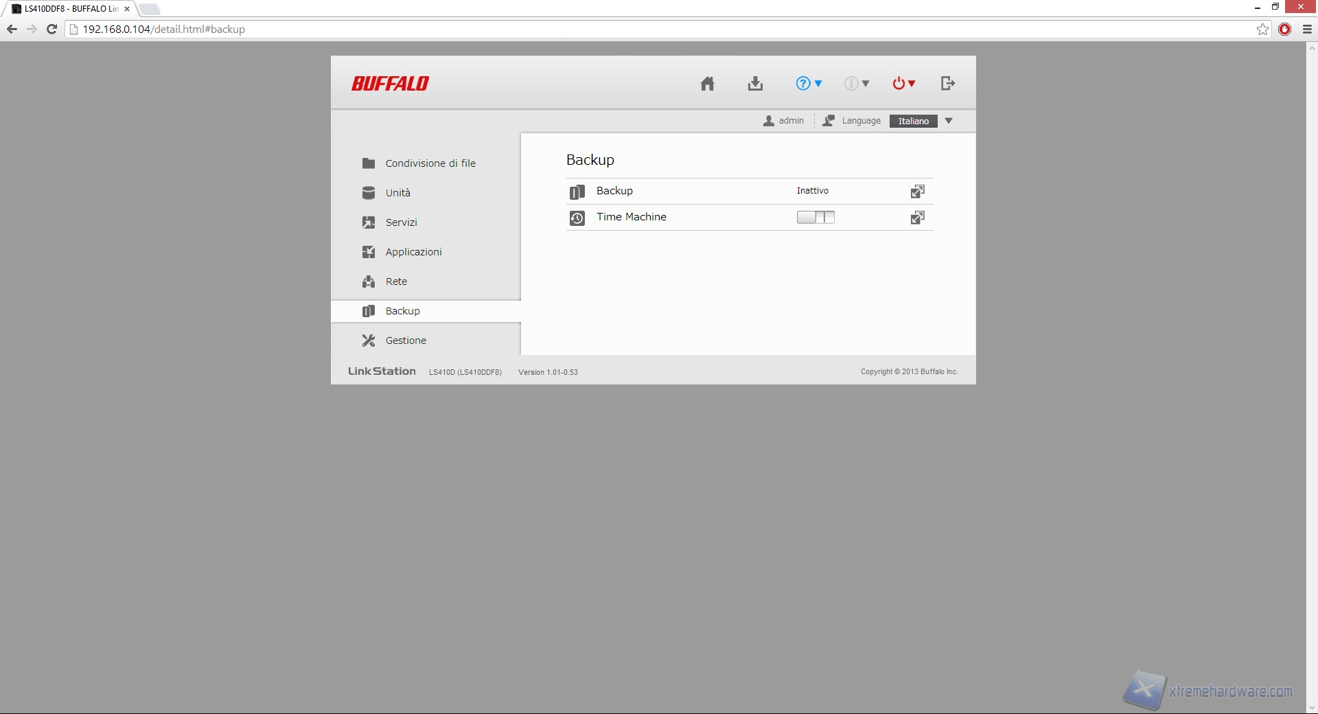 Tramite il menù "backup" possiamo selezionare un altro dispositivo NAS TeraStation o LinkStation sul quale effettuare i backup del nostro LS410D, oltre che attivare/disattivare la funzione Time Machine, adoperata dai sistemi Apple.