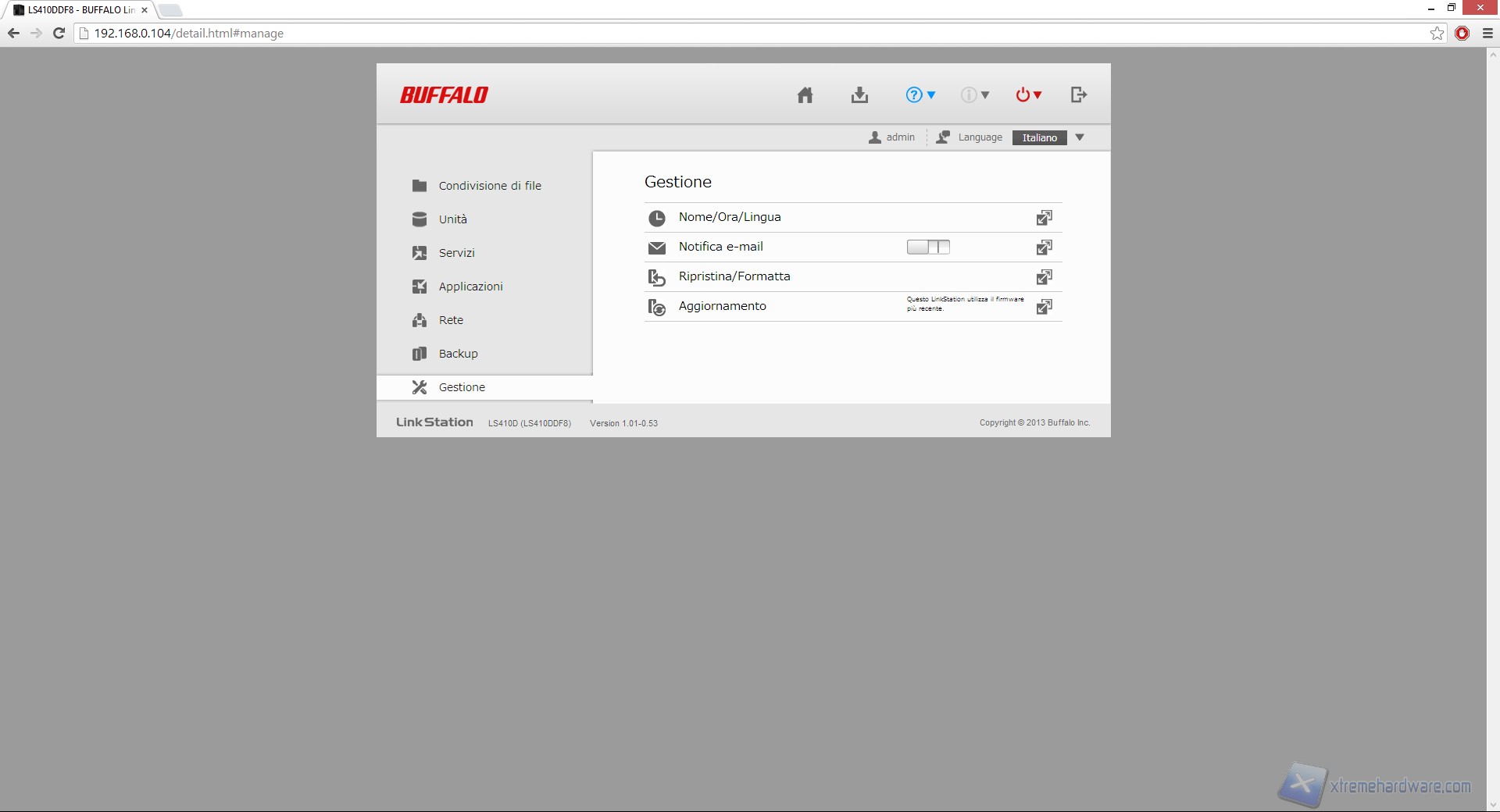 Infine la sezione "Gestione" ci consente di modificare ed impostare parametri come l'ora, la lingua di sistema, le notifiche email oltre che permetterci di reimpostare le impostazioni di fabbrica del prodotto ed aggiornarlo.